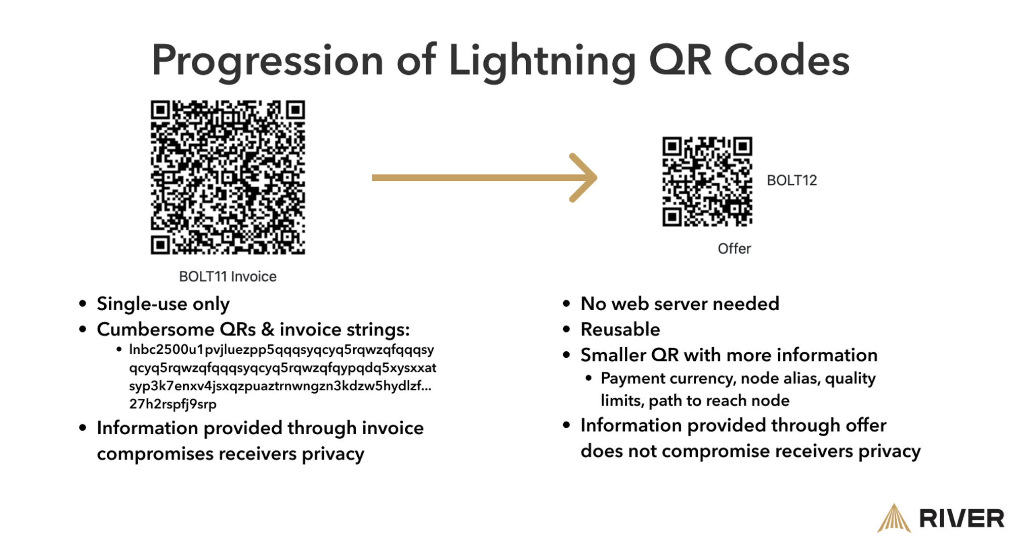 ID pembayaran saat ini seperti Alamat Lightning sangat berharga tetapi hampir selalu bersifat custodial. Pengguna harus bisa menukar kode QR yang dapat digunakan kembali untuk menerima pembayaran tanpa bergantung pada pihak ketiga. Kemampuan untuk digunakan kembali sangat penting: menyalin, menempel, dan mengirimkan faktur ke pihak lain memerlukan terlalu banyak langkah. Ketersediaan solusi sederhana akan memberikan manfaat bagi semua pengguna Lightning.