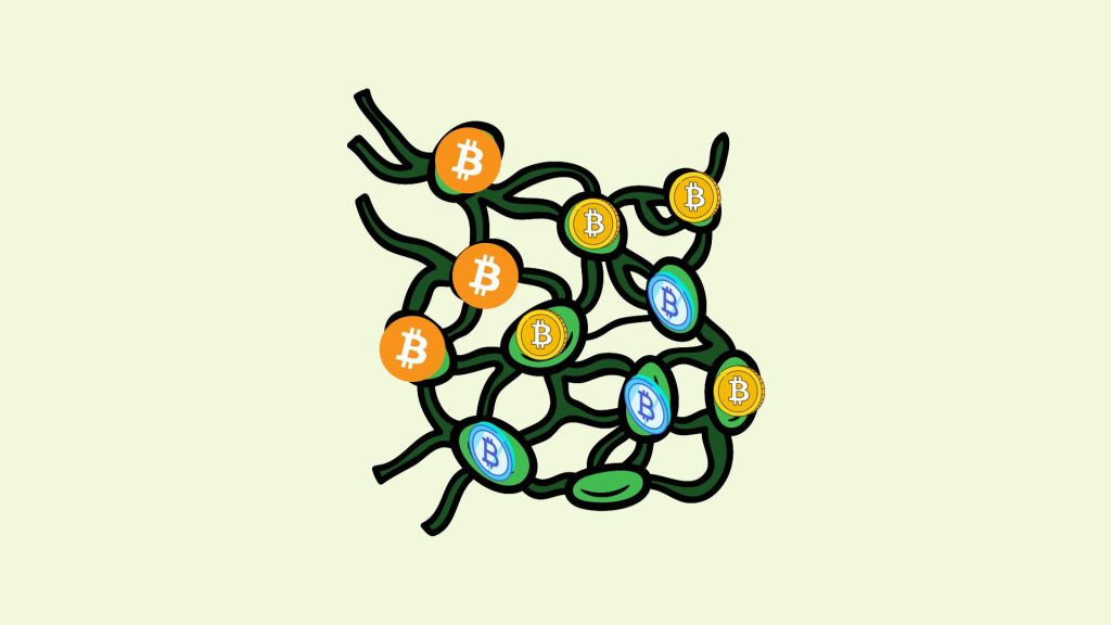 Node Bitcoin saling berbagi informasi untuk blok dan transaksi baru terjadi di antara mereka untuk menjaga setiap node tetap up-to-date pada keadaan terkini blockchain. Pembagian ini terjadi melalui jaringan peer-to-peer; setiap node terhubung langsung ke beberapa node lain dan berbagi data dengan node-node tersebut. Kebanyakan node terhubung melalui internet, tetapi beberapa node terhubung melalui satelit, jaringan mesh, atau bahkan radio. Jaringan peer-to-peer ini memastikan bahwa tidak ada otoritas pusat yang mengendalikan blockchain.