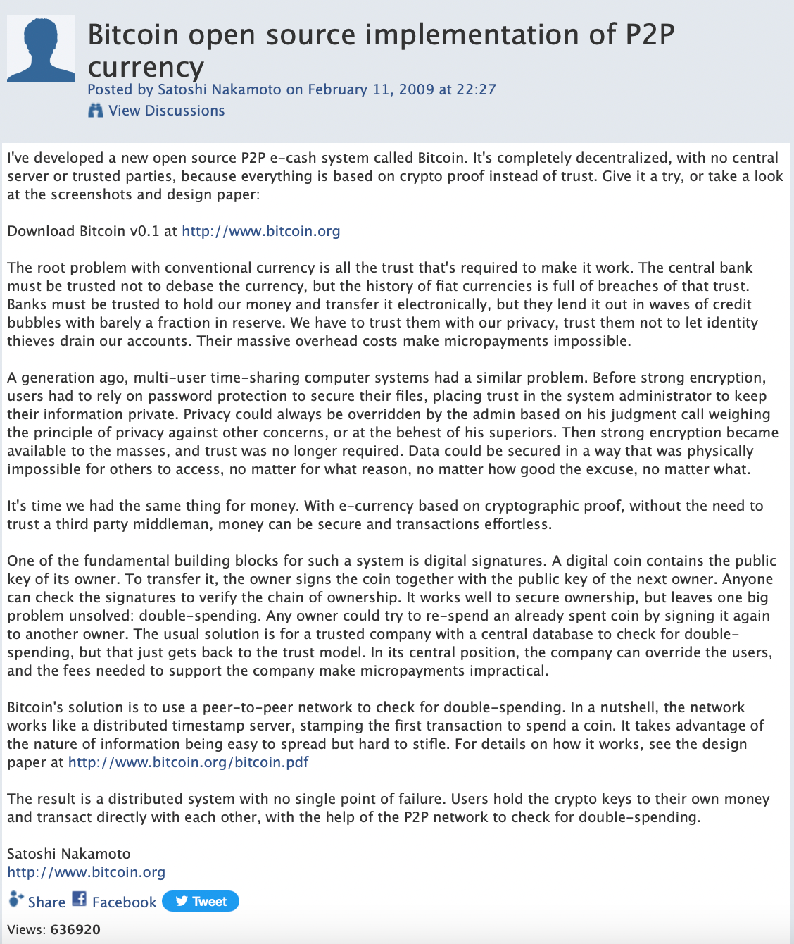 Akar permasalahan dari mata uang konvensional adalah rasa percaya yang diperlukan untuk membuat sistem keuangan berjalan. Institusi keuangan perlu dipercaya untuk tidak menurunkan nilai uang, tetapi sejarah membuktikan bahwa sistem mata uang fiat penuh dengan pelanggaran kepercayaan. — Satoshi Nakamoto, Februari, 2009.